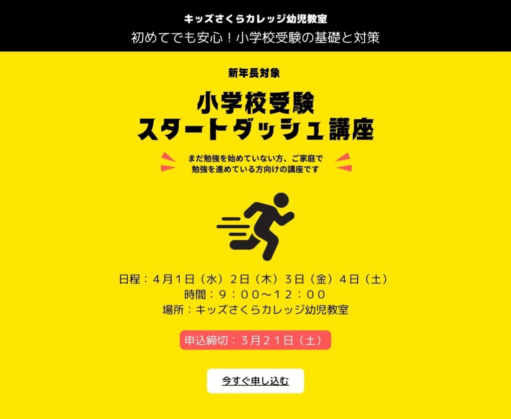スタートダッシュ講座申し込み 保護者氏名(必須) お子様氏名(必須) お子様氏名フリガナ(必須) 性別(必須) 男の子女の子 住所(必須)郵便番号から番地まで記入してください メールアドレス(必須) 電話番号(必須) 志望校(必須) 千葉日本大学第一小学校昭和学院小学校日出学園小学校国府台女子学院小学部成田高等学校付属小学校聖徳大学附属小学校その他江戸川学園取手小学校開智望暁星国際流山 支払方法選択 銀行振込直接払い 銀行振り込みの場合は1週間以内にお振込みください。 振込先:千葉銀行 新八千代支店 2027850 株式会社パスカルシイエーアイ (講座名義フリガナでは カ)パスカルシイエーアイ ウエダ トヨハルとなります) 直接払いの場合は1週間以内に教室までお支払いください メッセージ本文 (任意) お休みになる日がある場合はこちらにご記入ください。また今までの学習歴やご家庭でどのように取り組んできたのかを簡単にご記入ください。